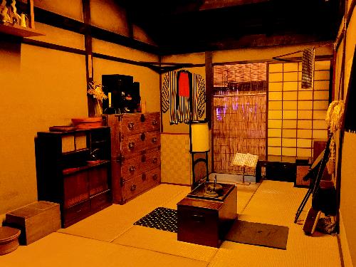 A row house is partitioned only by thin walls for common people to live in. Many people in Edo, the old Tokyo, lived in this type of house.