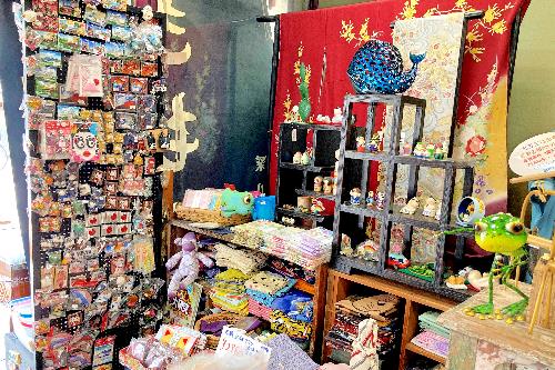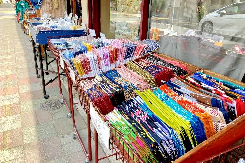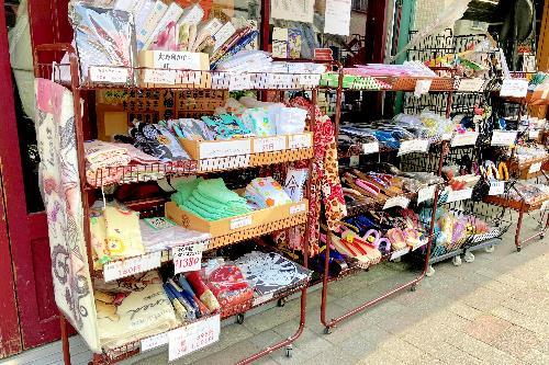 At the stall outside, you can purchase many products that make perfect souvenirs, such as Japanese towels called “tenugui”, cushion covers made of genuine kimono material, and Japanese sandals [“geta”]. The price can be as little as 200-300 yen, and these items are not bulky, so they won’t take up a lot of room in your suitcase!