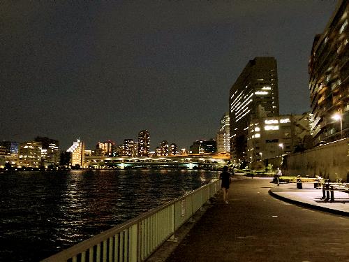 After crossing the Kiyosu Bridge, take the stairs down to the Sumida River Terrace, which is runs all along banks of the river. It is a paved promenade frequently used for walking and jogging, from which you can see much of the scenery of Tokyo.